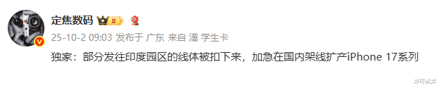 有消息显示,为了增加中国市场iPhone 17系列机型产能,苹果居然将部分发往印度园区的线体给扣了下来,说的直白一点,就是借印度产线用一下,但问题是,相关产线一旦在中国组装厂落地,后续想要再发给印度那边,就没那么容易了。